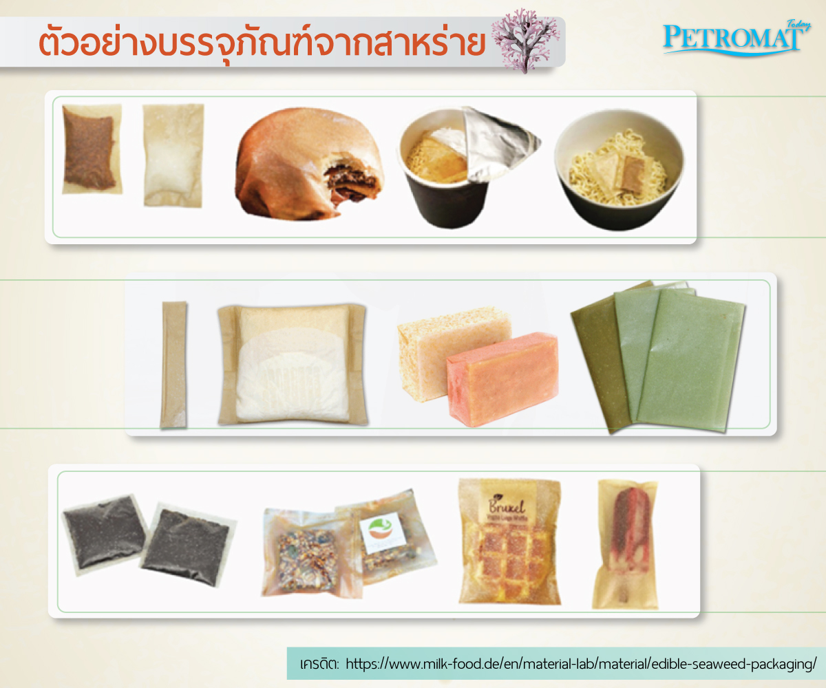 • กินได้ (Edible): บรรจุภัณฑ์จากสาหร่ายในบางรูปแบบสามารถรับประทานได้ ซึ่งเป็นนวัตกรรมที่ช่วยลดขยะได้อย่างสมบูรณ์แบบ